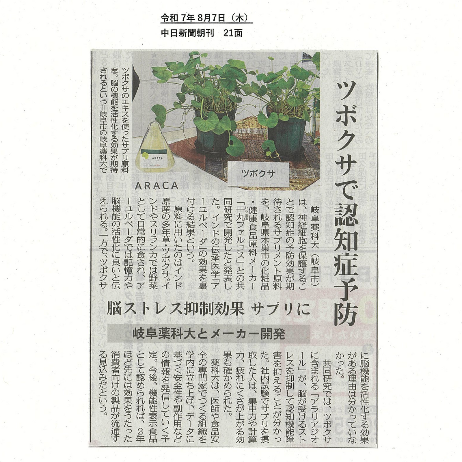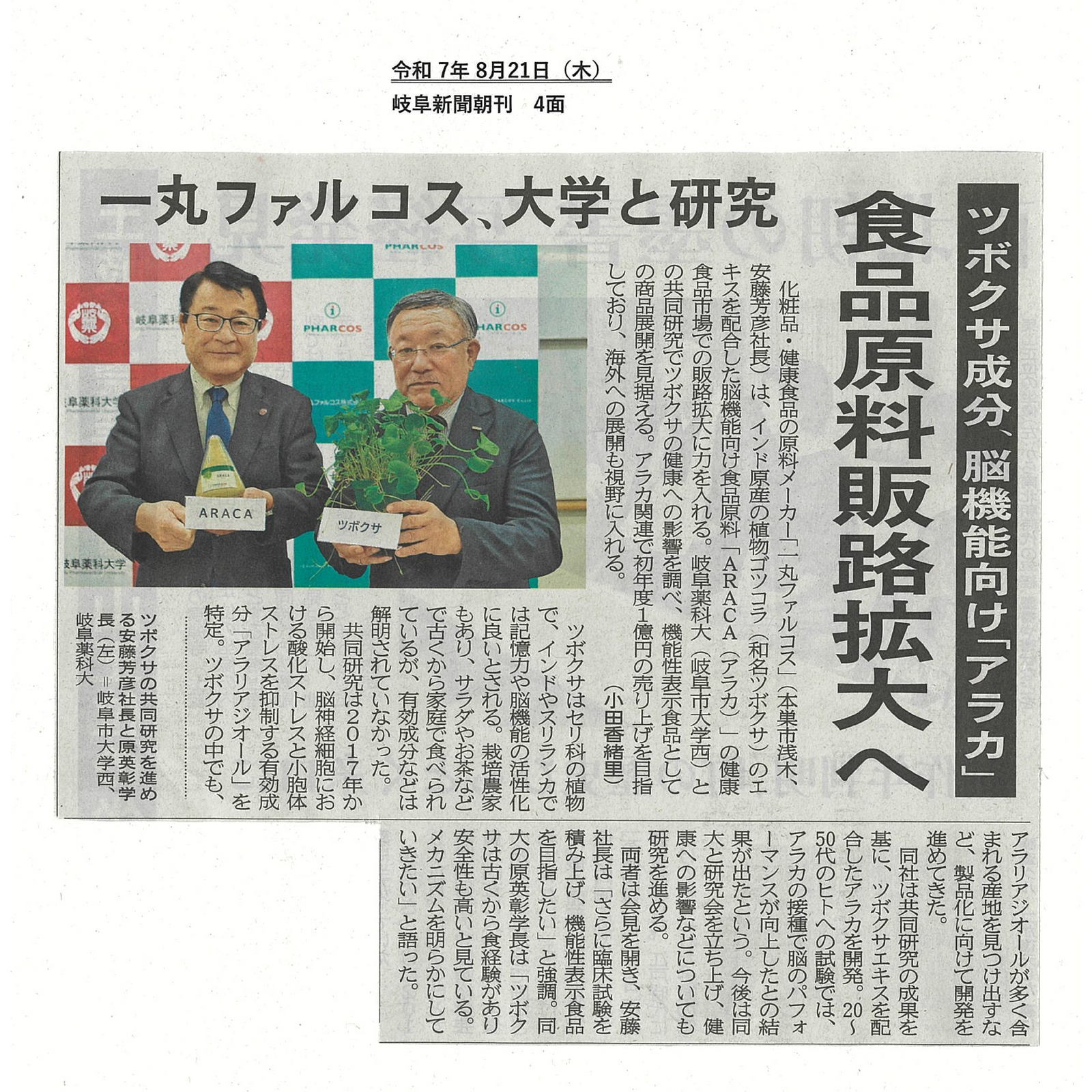 化粧品・健康食品の原料メーカー「一丸ファルコス」(本巣市浅木、安藤芳彦社長)は、インド原産の植物ゴツコラ(和名ツボクサ)のエキスを配合した脳機能向け食品原料「ARACA(アラカ)」の健康食品市場での販路拡大に力を入れる。